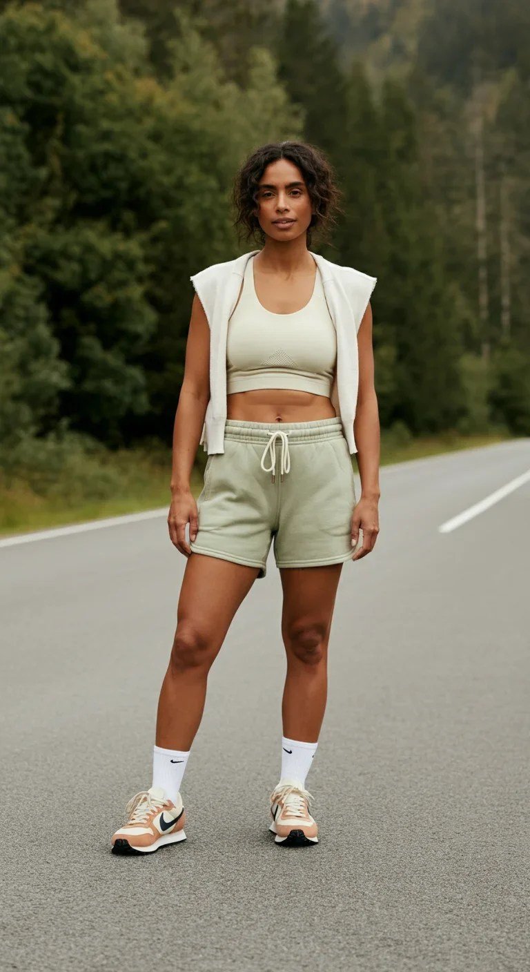 An olive utility vest introduces practical, functional flair to simple athleisure basics. Layered over black compression shorts and a white technical tee, the outfit feels active and adventurous. Combat boots complete the look with a bold edge that pushes traditional athleisure into street-style territory.