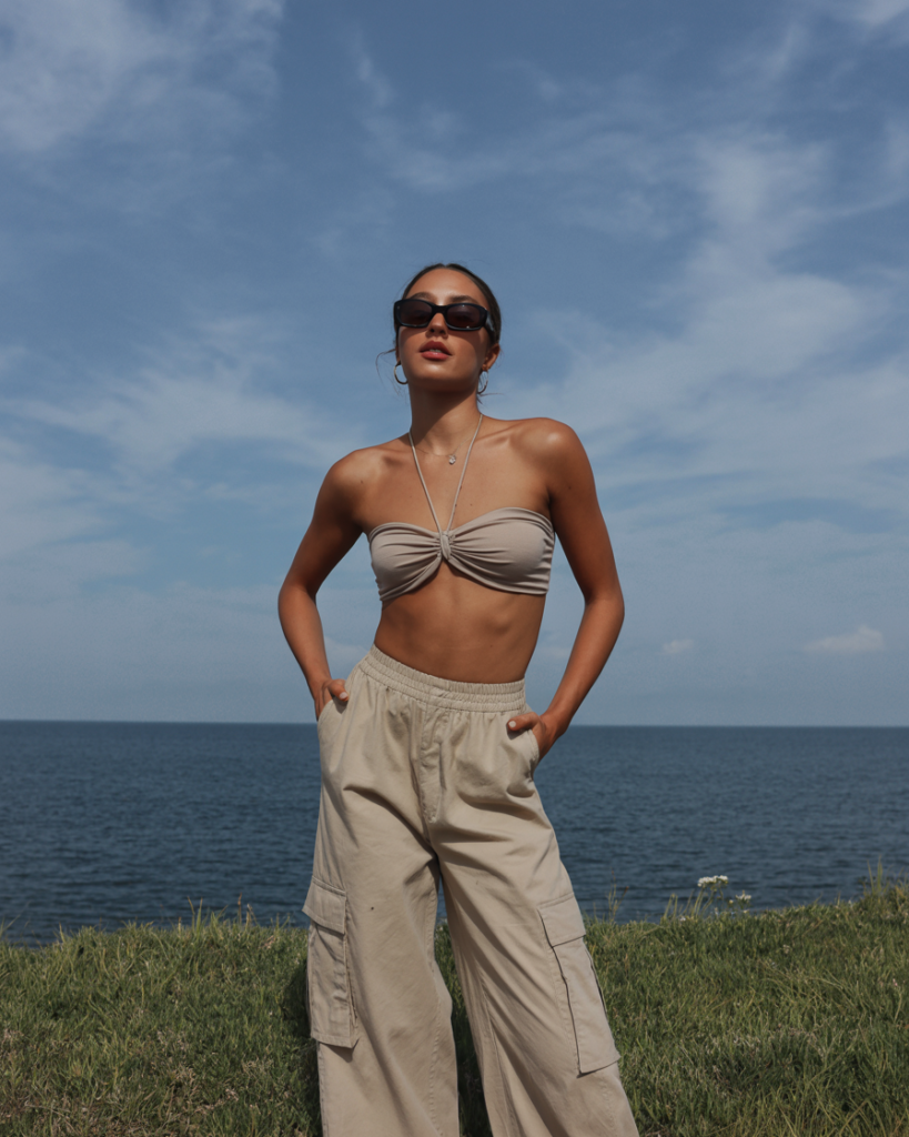 Pair cargo pants with a fitted bandeau top and flat strappy sandals, accessorizing with a straw hat to create a breezy warm-weather outfit.