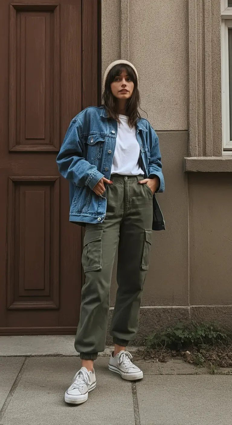Layer an oversized denim jacket over cargo pants with a simple white t-shirt underneath and canvas sneakers to create an easygoing everyday look that never feels overdone.
