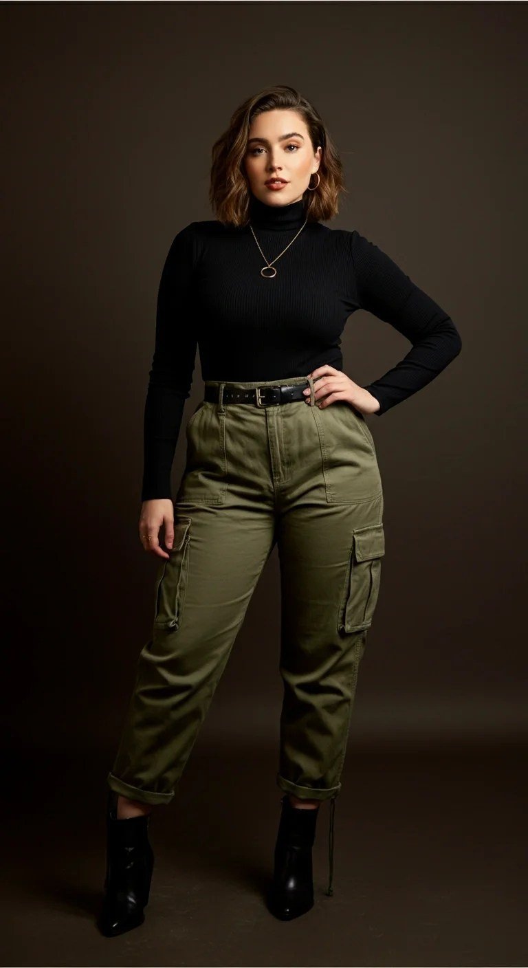 Combine cargo pants with a sleek fitted turtleneck and ankle boots in complementary tones, keeping accessories minimal to achieve a clean and cozy look ideal for cooler weather.