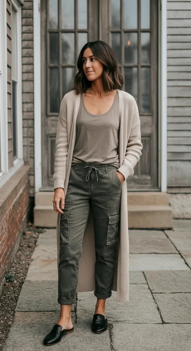 Layer a long cardigan over cargo pants and a basic tank top, finishing with slip-on mules for a relaxed transitional-season look that feels soft and effortless.