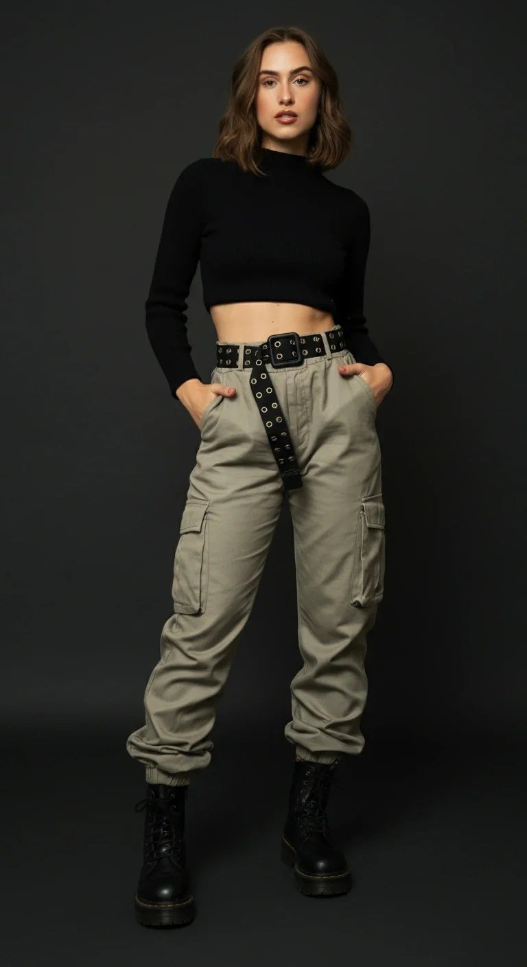 Choose high-waisted cargo pants styled with a fitted crop top and define the waist using a bold statement belt, then complete the look with combat boots for a confident and casual day-out outfit.