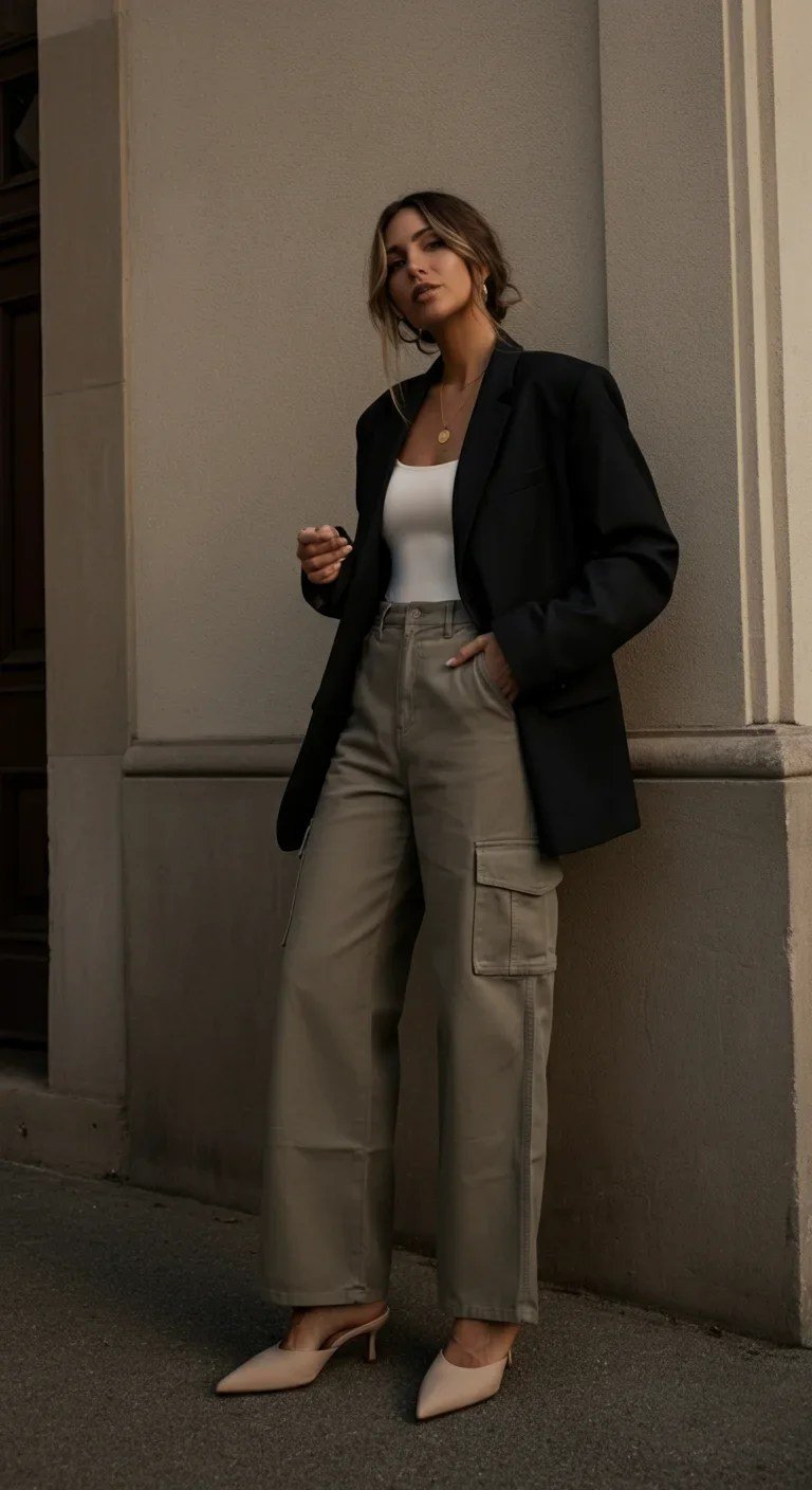 Wear wide-leg cargo pants with an oversized black blazer layered over a fitted white bodysuit, finishing the outfit with pointed-toe mules to create a sophisticated business-casual ensemble with modern structure.