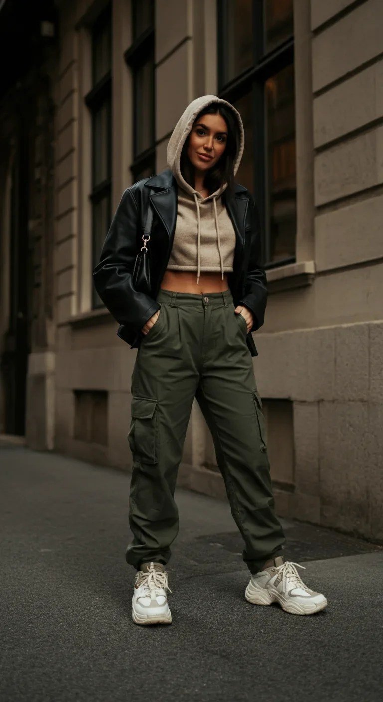 Pair cargo pants with a cropped hoodie and layer a leather jacket on top, finishing with stylish sneakers to create a sporty-luxe outfit perfect for relaxed weekend activities.