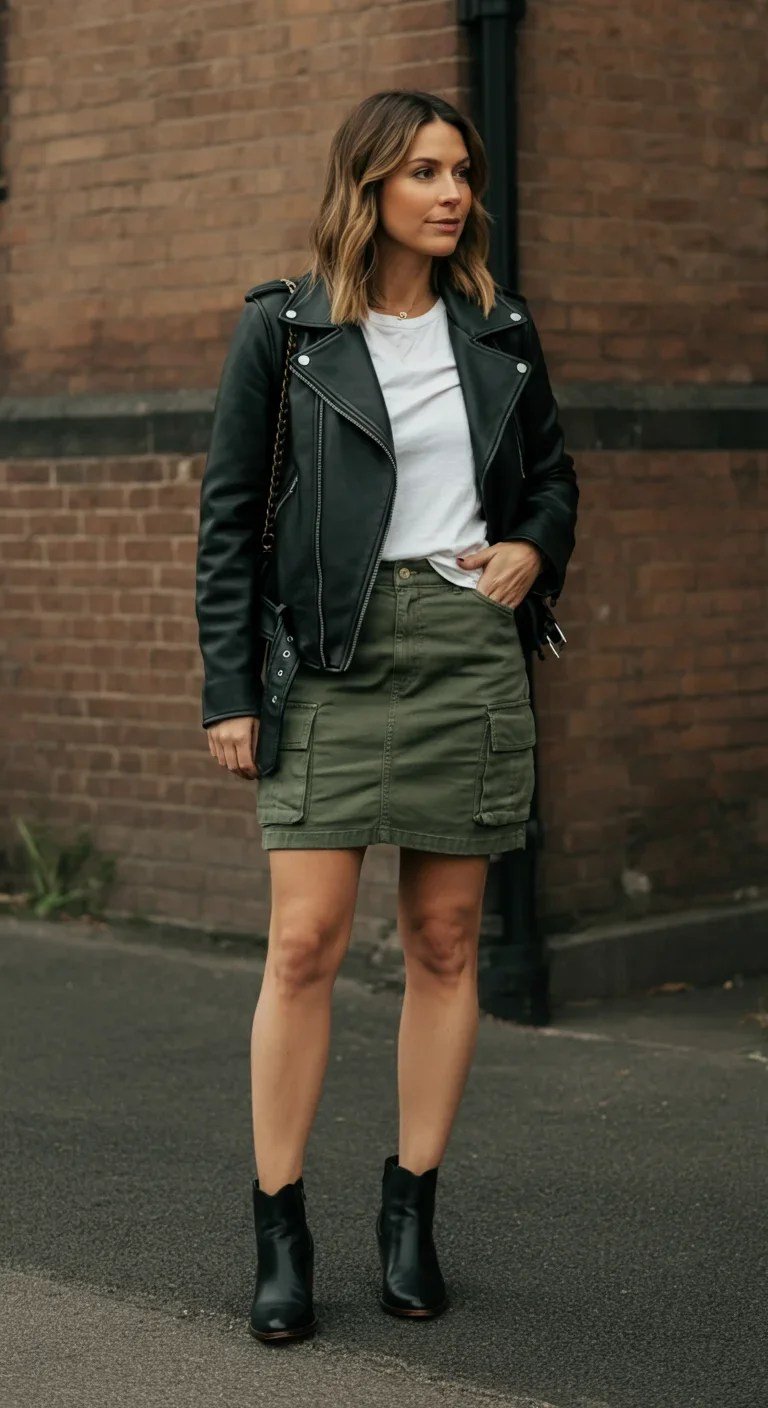 6. Leather Jacket + Green Cargo Mini
