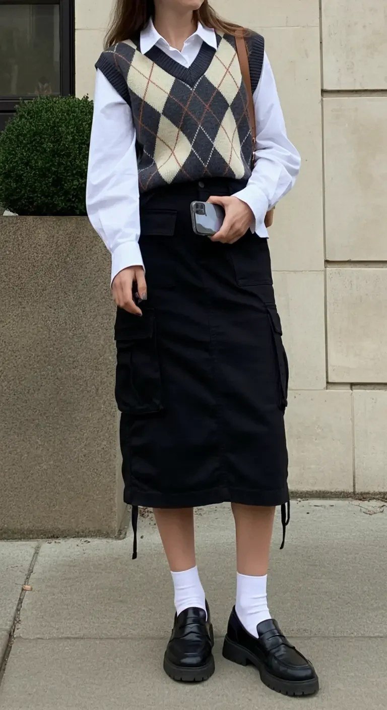 The black cargo pencil skirt keeps the outfit current, while penny loafers complete the academic-inspired aesthetic. Ideal for office days or campus life.