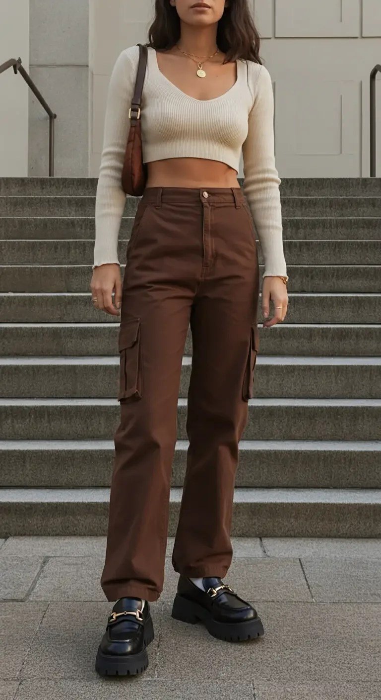 A ribbed cream crop top pairs effortlessly with a brown high-waisted cargo skirt.