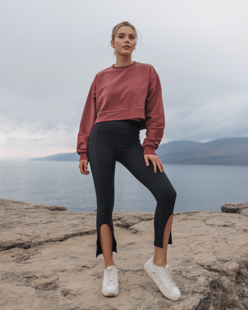 Split-hem leggings add a subtle stylish touch to a comfortable essential, and when paired with a cropped sweatshirt, they create a sporty yet refined everyday look. The outfit feels relaxed but visually interesting—perfect for daily wear, casual outings, or chill weekends.