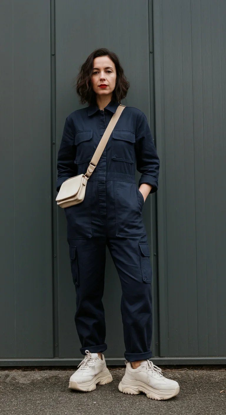 A jumpsuit simplifies getting dressed while still offering style, shape, and comfort in one piece. Add chunky sneakers and you instantly get a relaxed, youthful, and trendy casual outfit. It’s perfect for busy schedules, travel days, or moments when you want zero effort but maximum style impact.