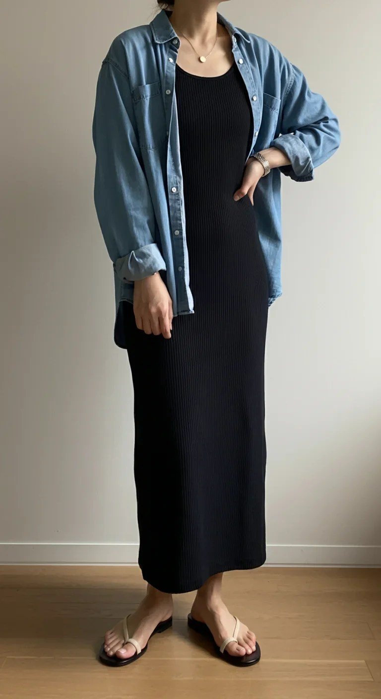 A fitted ribbed tank dress layered with a denim shirt gives you the best of both worlds—structured yet relaxed, feminine yet casual. You can wear the shirt open, tied around the waist, or buttoned depending on your mood and weather. It’s versatile, easy to style, and great for everyday life.