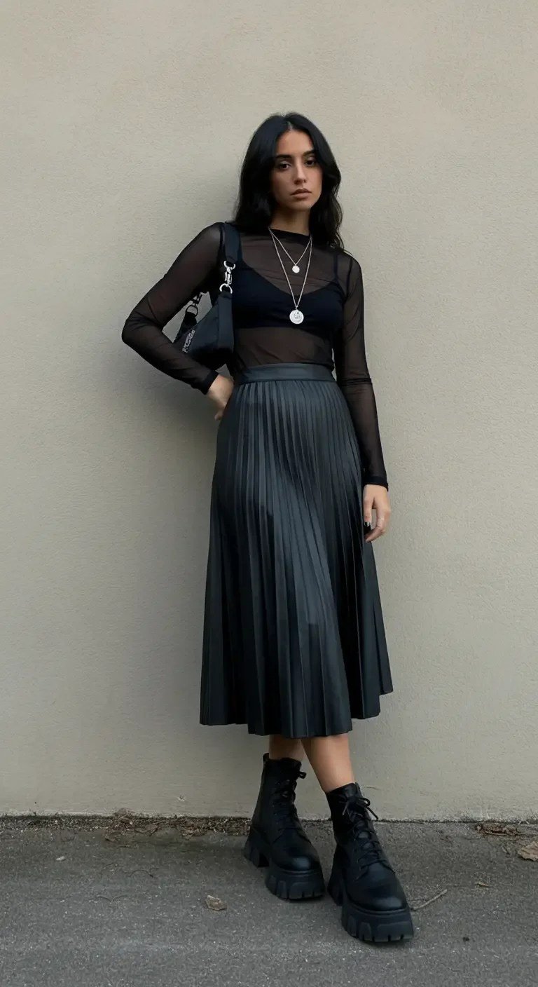 A leather midi skirt paired with a fitted mesh top delivers an edgy but polished appearance. The skirt offers structure while allowing enough movement to enjoy the concert freely. Platform boots provide height without compromising comfort, making them ideal for long wear. Layered necklaces or subtle metallic accessories add extra dimension, giving the look a confident, fashion-forward attitude.