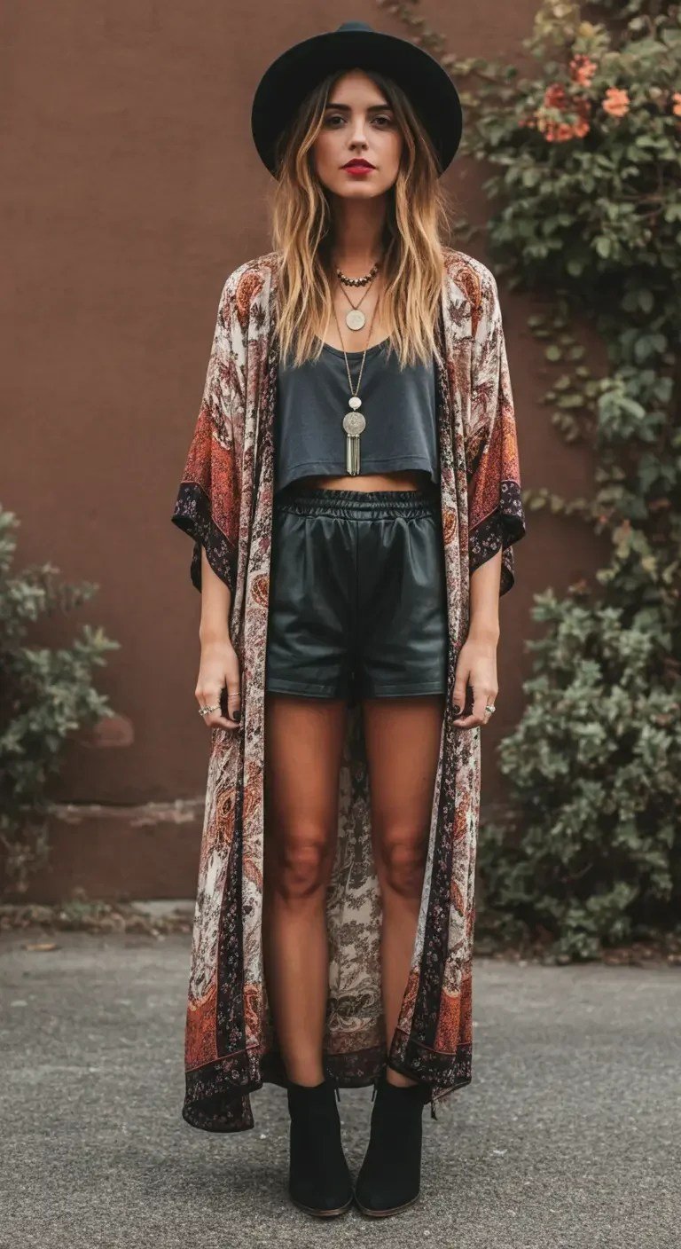 A flowing printed maxi kimono adds dramatic movement as you walk or dance. Layering it over leather shorts and a fitted crop top creates contrast between soft and structured elements. Ankle boots make the outfit functional, while delicate layered necklaces introduce a bohemian charm. This combination feels expressive, stylish, and light enough for a lively concert atmosphere