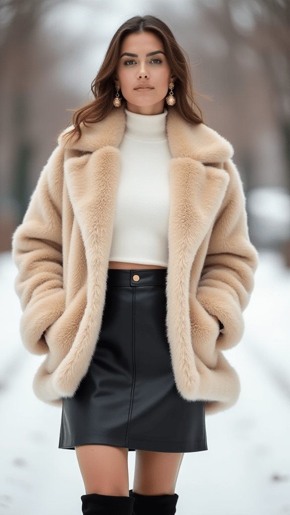 Pair a leather mini skirt with a plush faux fur coat for a mix of sexy and cozy. Knee-high boots complete the look, keeping you warm while turning heads. Bonus: the fur doubles as a quick blanket during late-night food runs.