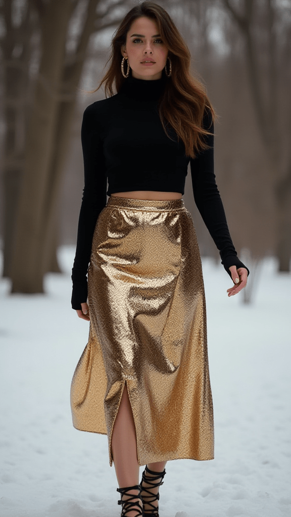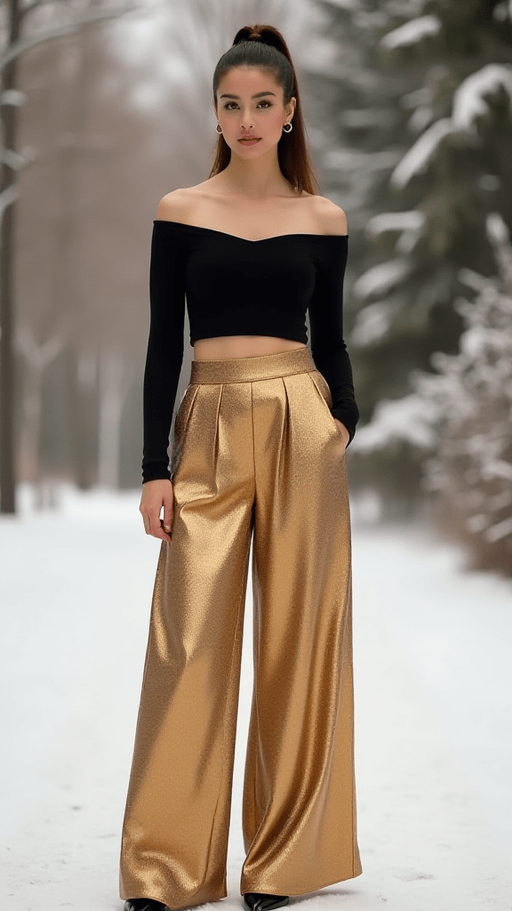 Flowy metallic pants paired with a simple top create a standout winter look. They’re eye-catching and perfect for spontaneous dancing or capturing Instagram-worthy shots.