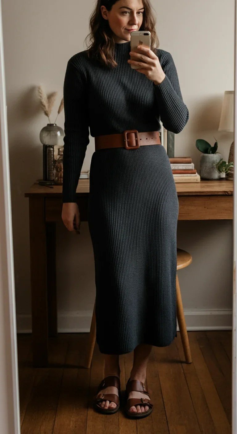 A classic sweater dress becomes instantly elevated when paired with knee-high leather boots. The texture contrast adds depth while keeping the look minimal. Finish with delicate jewelry to maintain understated elegance.