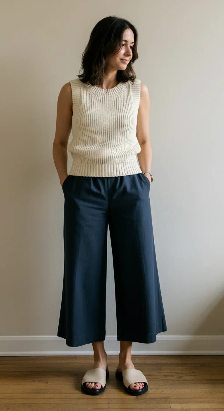 A basic knit tank pairs effortlessly with wide culottes for a modern silhouette. The contrast in proportions creates visual balance while maintaining simplicity. Minimal slide sandals complete the contemporary vibe.