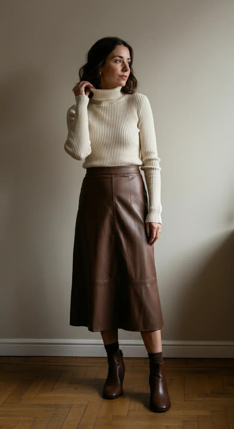 Texture takes center stage in this refined pairing. A ribbed turtleneck balances the smooth finish of a leather midi skirt, creating subtle sophistication. The midi length keeps the outfit versatile for both day and evening. Complete the look with simple stud earrings and a sleek wristwatch.