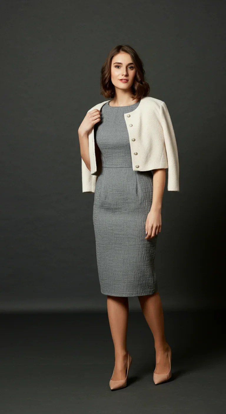 A textured pencil dress brings depth and elegance without needing extra layers. A cropped cardigan adds warmth and structure while keeping proportions flattering. Nude pumps maintain a clean and professional finish. Pearl stud earrings offer a timeless, refined touch.