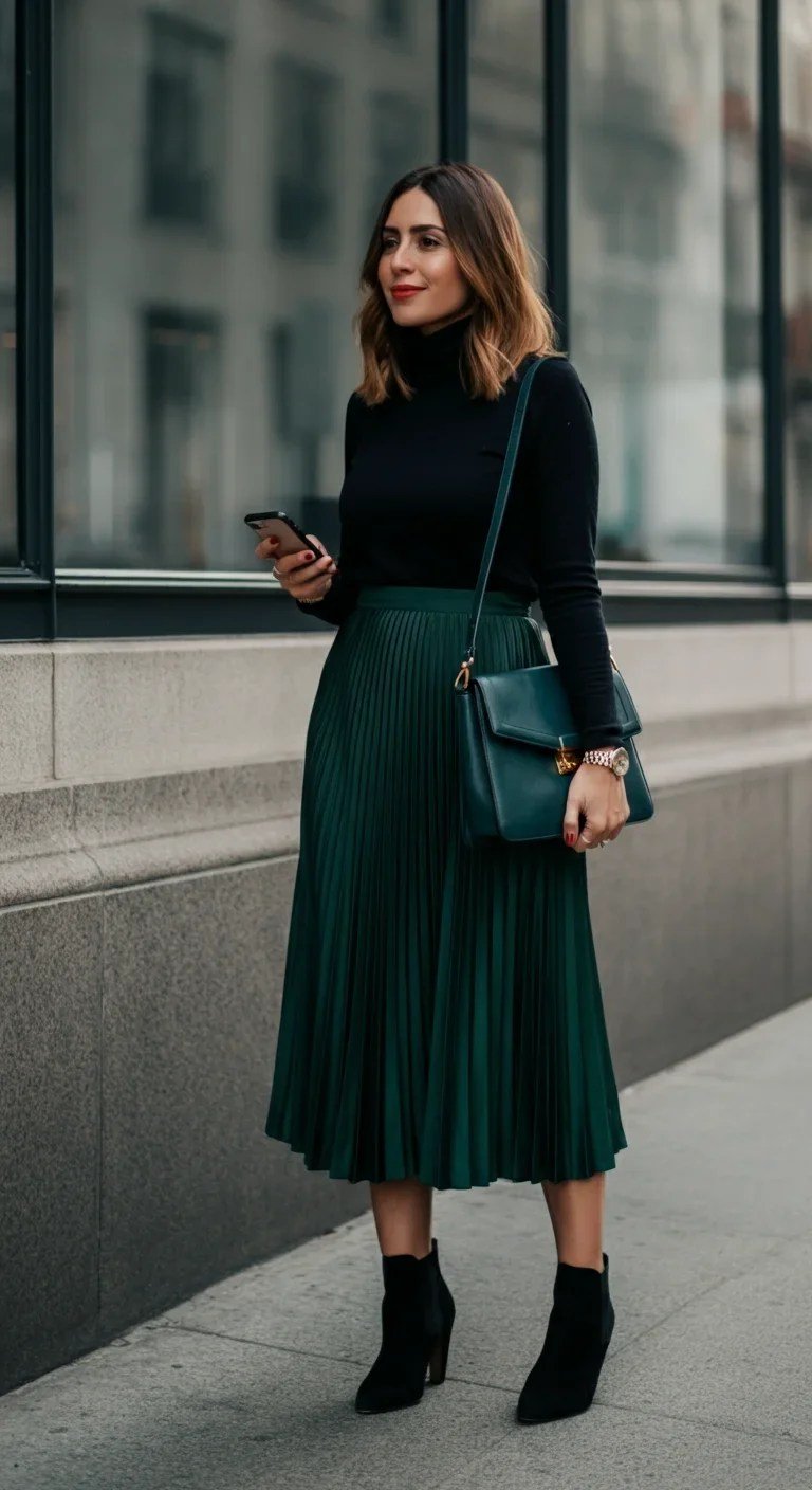 A pleated midi skirt brings graceful movement and quiet sophistication to office wear. When paired with a fitted turtleneck, the look feels sleek and well-balanced. Ankle boots add a contemporary touch, while a structured handbag keeps everything polished. This outfit transitions seamlessly from desk meetings to after-work gatherings.