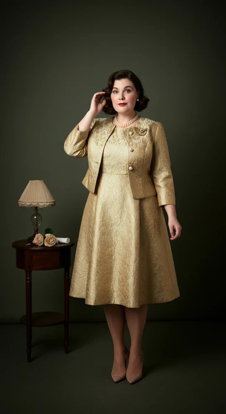 This coordinated dress and jacket set feels timeless and refined. The brocade fabric brings richness, while the A-line shape flatters naturally. The jacket offers styling flexibility and added coverage, making this a thoughtful option for traditional celebrations.