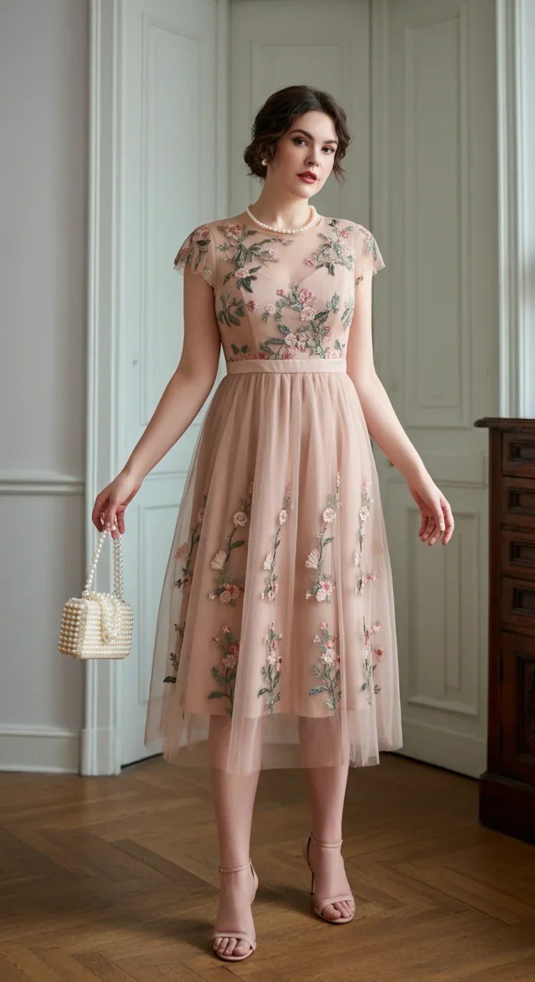 This midi dress blends delicate embroidery with airy tulle for a soft, romantic finish. The length keeps the look refined and wedding-appropriate, while gentle sleeve coverage adds comfort. Paired with simple pearl or metallic accessories, the outfit feels feminine and classic without being overly ornate