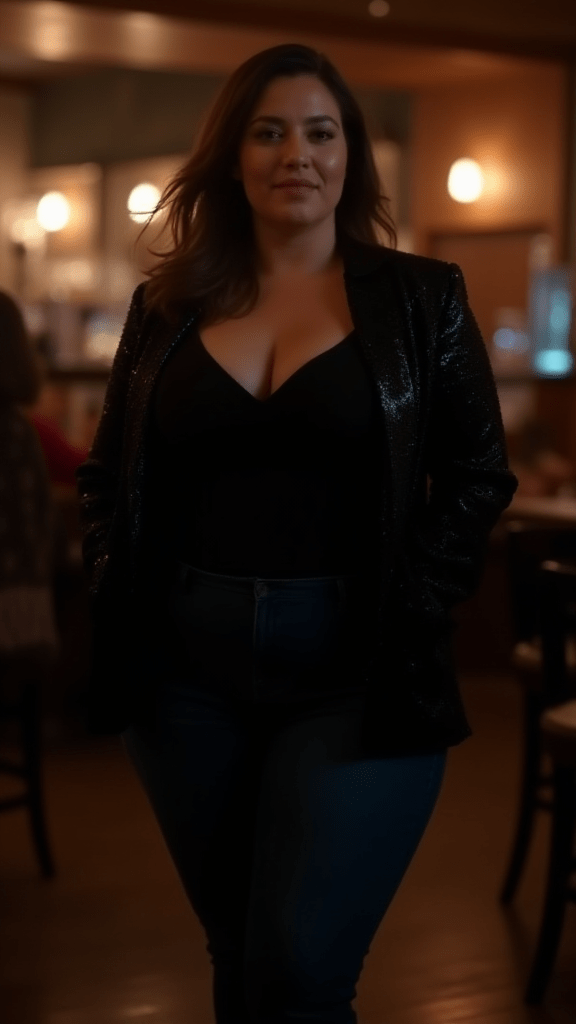 A black sequin blazer layered over a simple black top and jeans adds festive sparkle to any winter outfit. This look makes a bold statement while remaining office-appropriate or party-ready.