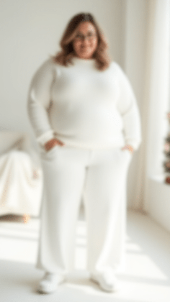 An all-white outfit with a white sweater, wide-leg trousers, and sneakers creates a clean and fresh winter look. Extra care is needed to avoid spills.
