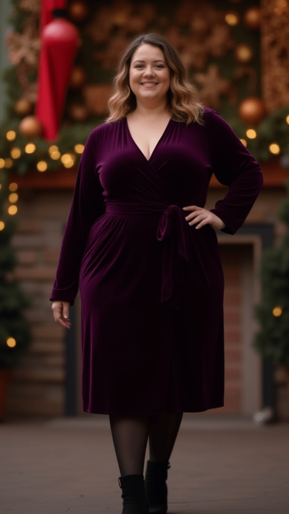 A deep purple velvet dress with black tights and heeled ankle boots gives off winter glamour suitable for parties. Using one velvet piece per outfit avoids overdoing the look.