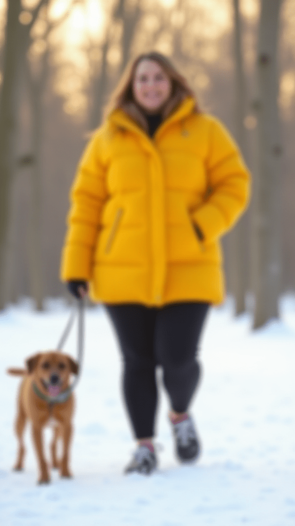 A bright yellow puffer coat with black leggings and sneakers combines warmth and visibility with a trendy, sporty look.