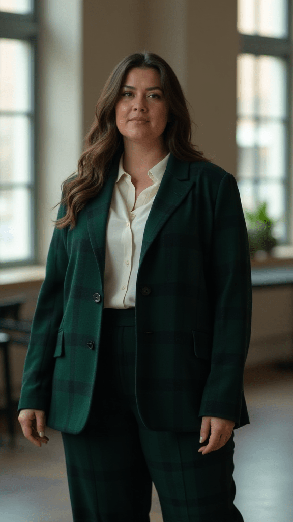 A dark green plaid blazer and wide-leg pants with a white blouse create a strong, professional winter outfit. Experimenting with different plaid patterns can add variety, while avoiding overly bright tartans keeps it sophisticated.