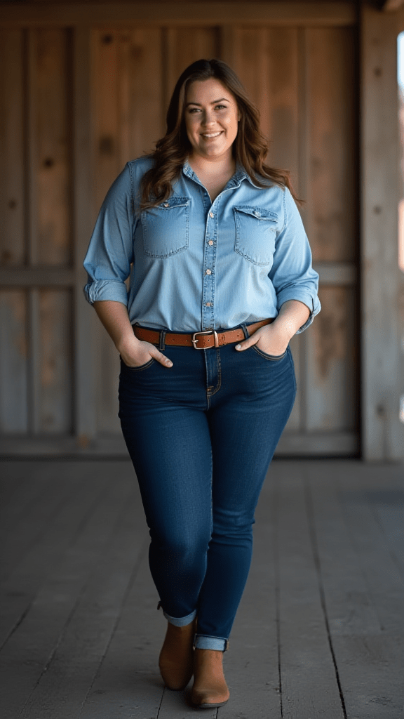 Pairing a light wash denim shirt with dark jeans and brown ankle boots creates a casual yet polished look. Keeping denim pieces in good condition is key to avoiding a dated appearance.