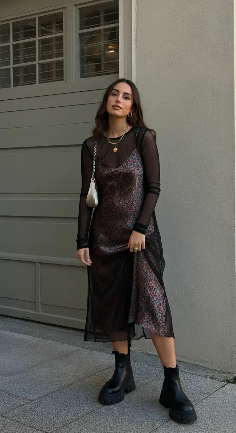 Chunky boots or platform sandals keep it from looking overly delicate. This one’s perfect for summer evenings or indoor events.