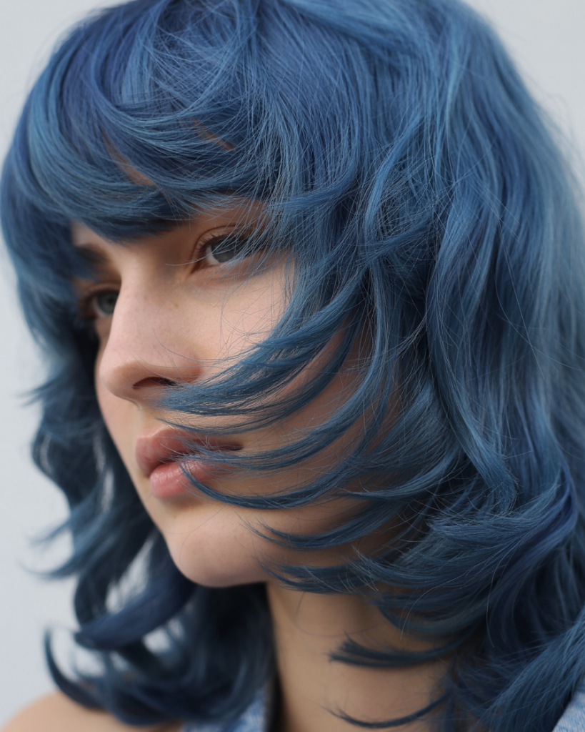 Denim blue sits perfectly between bold and understated. Feathered bangs add light texture and a breezy finish that feels effortless. The result is stylish yet wearable—ideal for someone who wants color without going too dramatic.