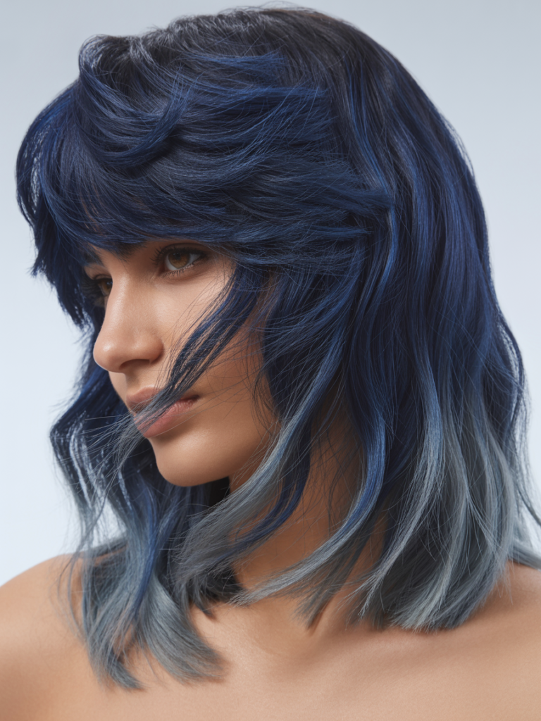 A gradual fade from deep navy roots to lighter blue ends adds visual depth and dimension. Textured bangs keep the look relaxed and modern, allowing for both polished and tousled styling depending on your mood.