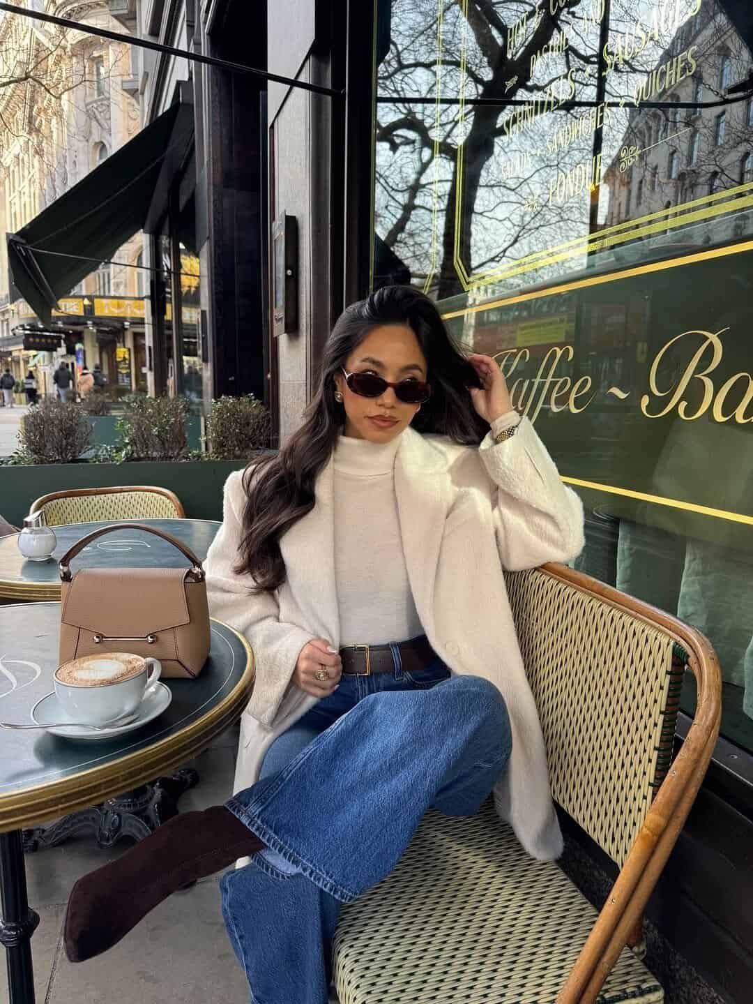 This pairing creates a smart blend of warmth, refinement, and relaxed charm. The polished coat, casual denim, and stylish accessories make it ideal for everyday office wear or professional outings where you still want to feel fashionable and confident.