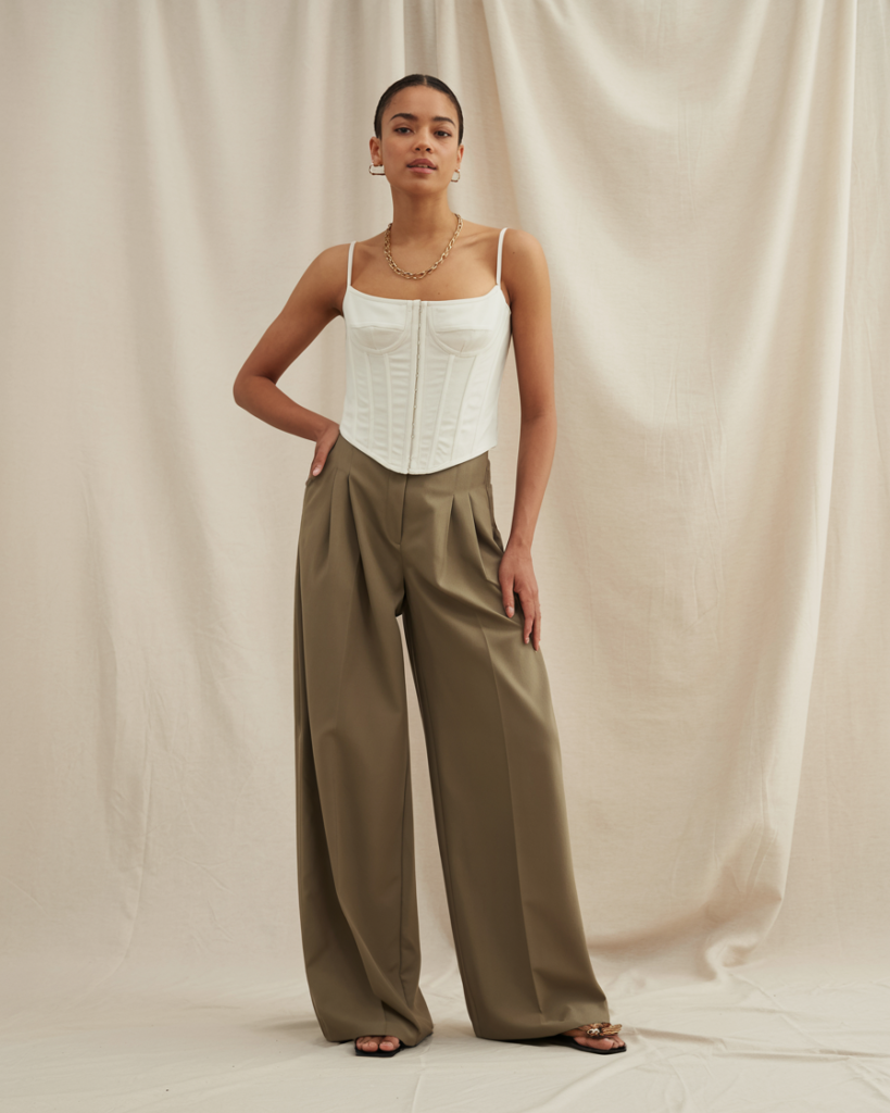 Blend structure and flow in this sophisticated outfit idea. A fitted corset-style top with flowy wide-leg trousers, pointed-toe mules, a long pendant necklace, oversized hoop earrings, and a small clutch make it ideal for dressier casual occasions.