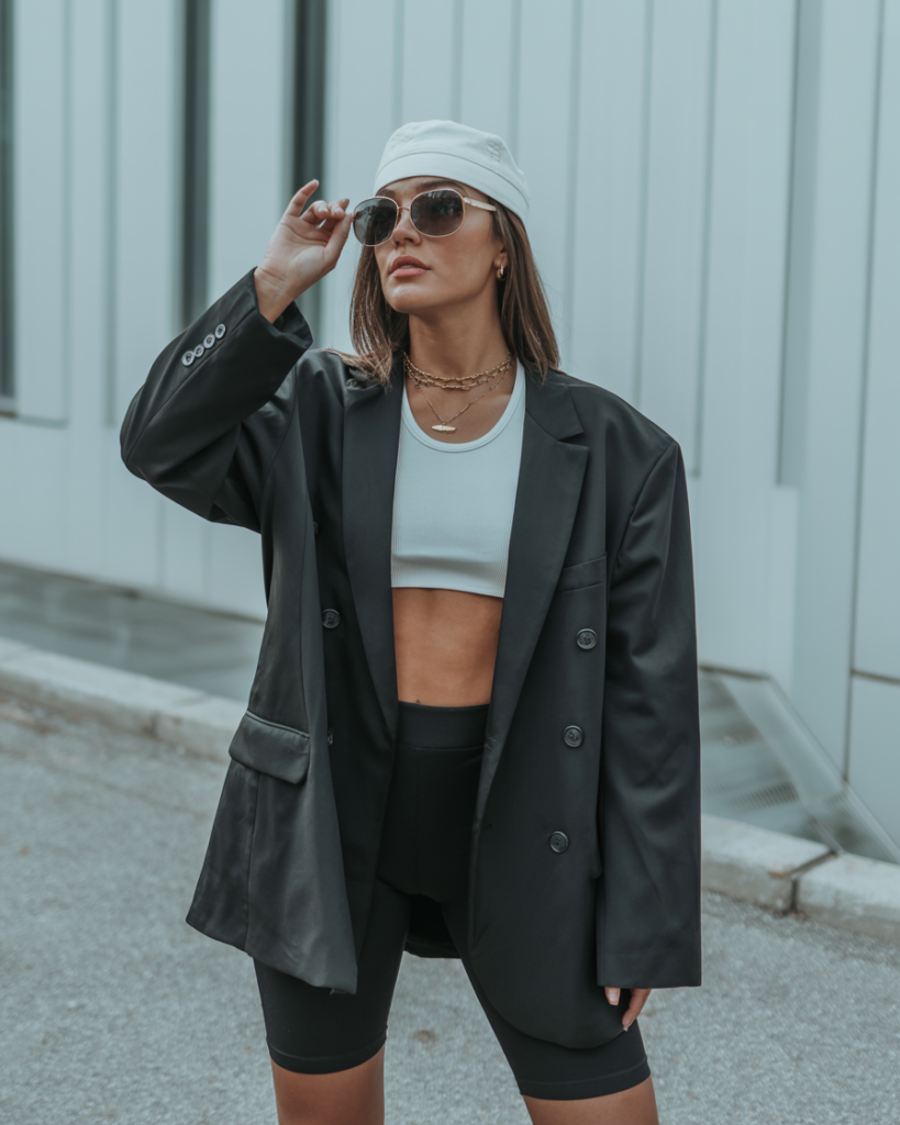 An oversized blazer adds unexpected sophistication to casual biker shorts and a crop top. Layer delicate necklaces, add cat-eye sunglasses, and finish with chunky sneakers for a chic, street-smart look. Perfect for turning casual daytime outfits into a baddie-approved statement.