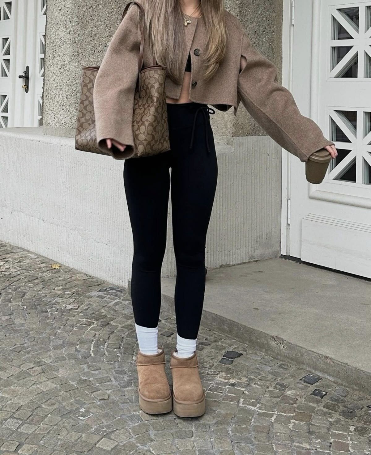 A cropped blazer worn with black leggings proves that leggings can look polished. Statement boots and sock accents give the outfit a fashion-forward edge that works for smart-casual settings.