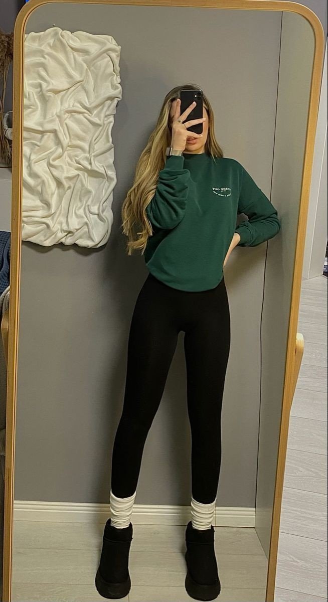 A deep green sweatshirt paired with black leggings creates a relaxed winter look that still feels put-together. The rich color adds seasonal warmth, while the fitted leggings balance the loose top. Boots and light sock detailing complete the outfit, making it ideal for casual days when you want comfort without looking underdressed