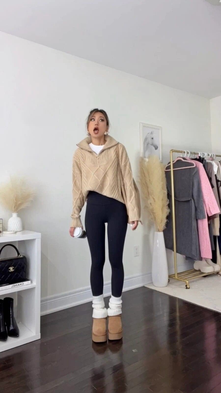 A playful oversized sweater matched with black leggings makes for an easy winter uniform. Platform boots add a bit of edge, while the neutral palette keeps everything cohesive. It’s the kind of outfit that feels relaxed but still intentional.