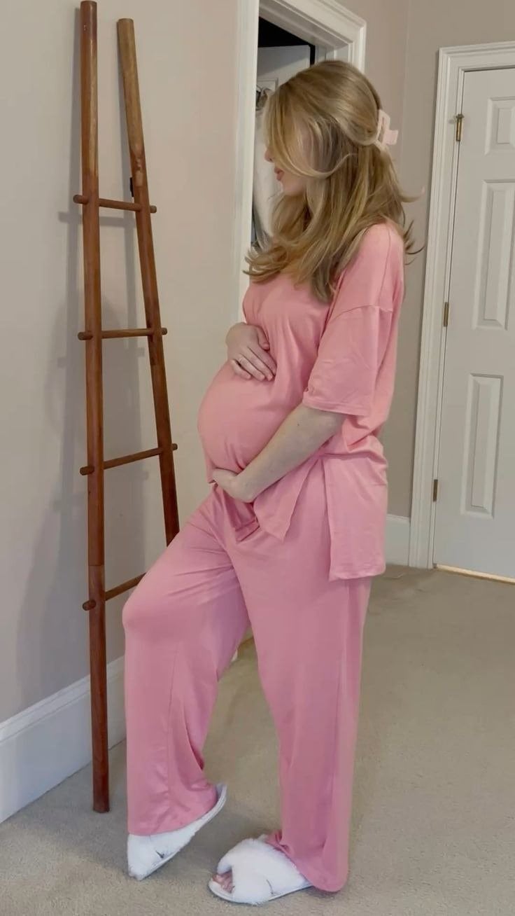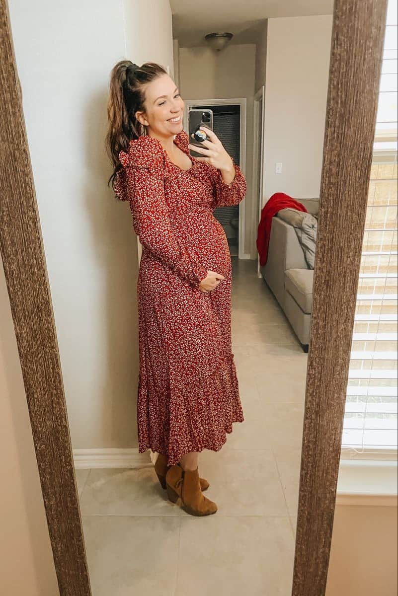 With its soft fabric and flowing design, this floral maxi dress is well suited for fall. The long sleeves offer warmth, and the loose shape allows the belly to grow comfortably. It works well for both daytime errands and evening plans.