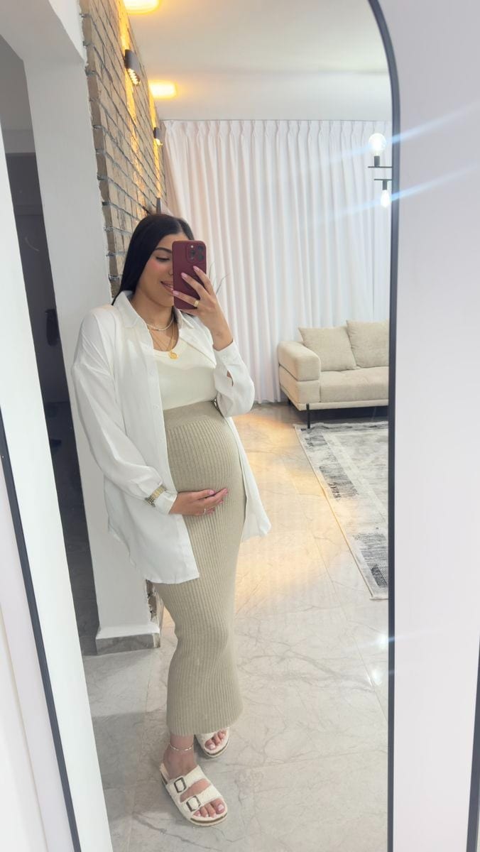 The gingham midi dress captures a cozy fall feel with its warm pattern and relaxed shape. Designed to sit comfortably above the belly, it offers ease of movement while still looking polished. Paired with casual footwear, it’s ideal for daytime activities in autumn.