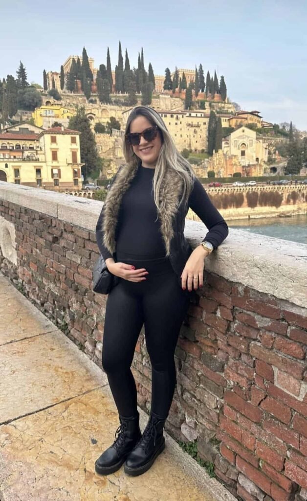 This all-black outfit creates a clean and confident look. The fitted pieces highlight the bump, while the faux fur layer adds warmth and texture. It’s a stylish option for travel or city outings in fall.