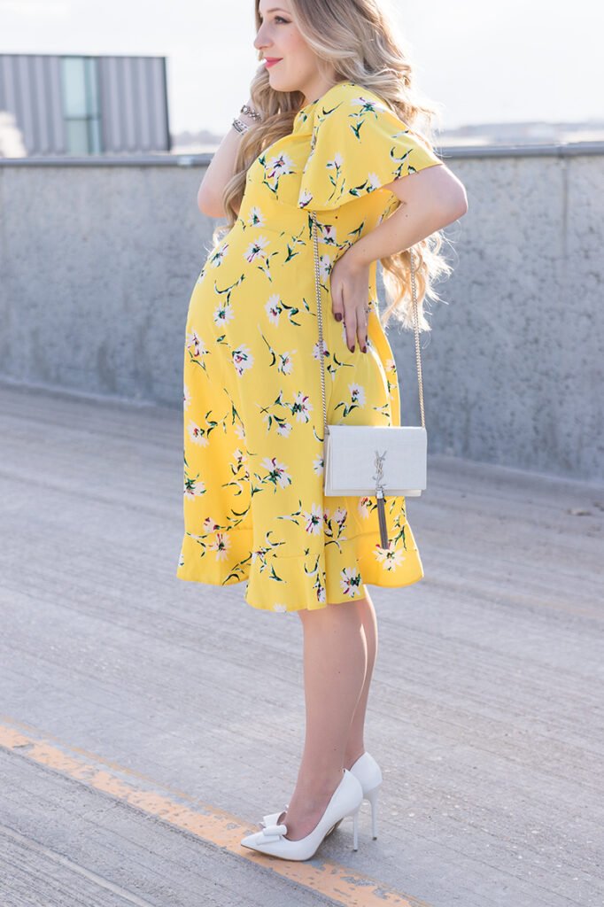 This floral maxi dress offers a soft and relaxed style that fits comfortably around the bump. The flowing fabric and gentle color make it a pleasant option for both casual days and more dressed-up occasions.