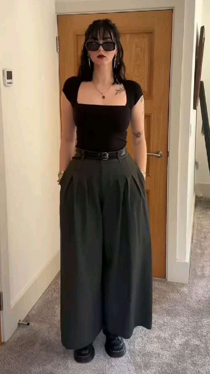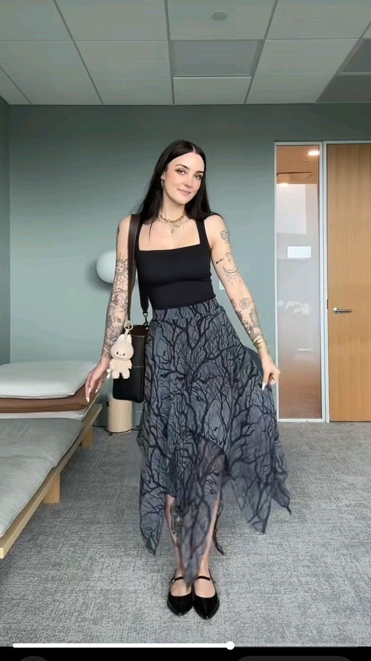A square-neck black top paired with a voluminous midi skirt creates a silhouette that is both dramatic and approachable. Accessories like statement silver jewelry, dark sunglasses, and platform boots elevate the gothic identity while remaining practical for daily wear. This combination illustrates how minimalistic silhouettes and carefully chosen accents can communicate gothic femininity with subtle intensity.