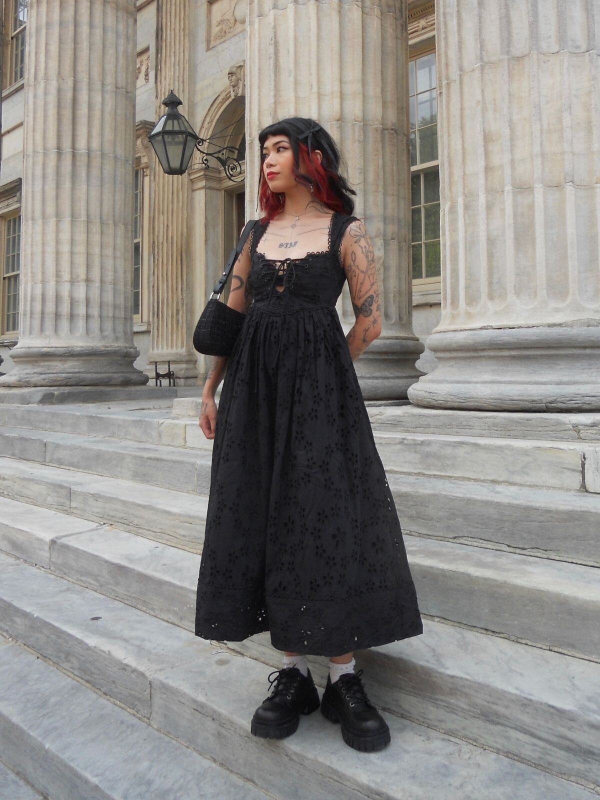 A floor-length black dress with lace accents captures gothic romantic history with precision. The corseted bodice emphasizes elegance and poise, while intricate lace provides ethereal detailing. Platform boots and subtle modern touches, such as hair highlights or tattoos, make the look contemporary without losing its Victorian essence. This style celebrates the timeless beauty of gothic heritage and demonstrates how traditional elements remain relevant in modern fashion.