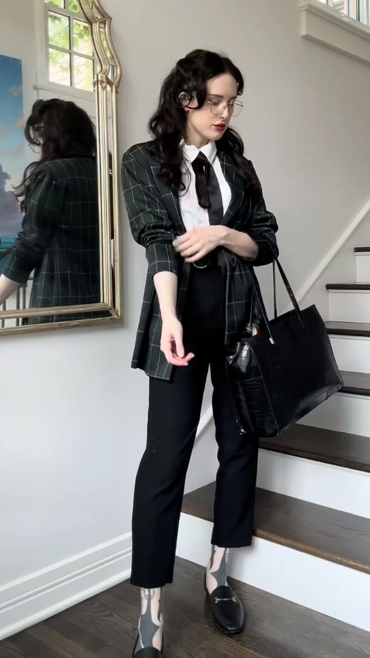 A forest-green plaid blazer layered over a crisp white shirt and black tie creates a polished, preppy gothic style. Black trousers and sleek loafers ground the look, while oversized glasses and a structured bag add intellectual flair. This outfit demonstrates that gothic aesthetics extend beyond evening drama, offering refined, wearable expressions of darkness and romance for day-to-day settings.
