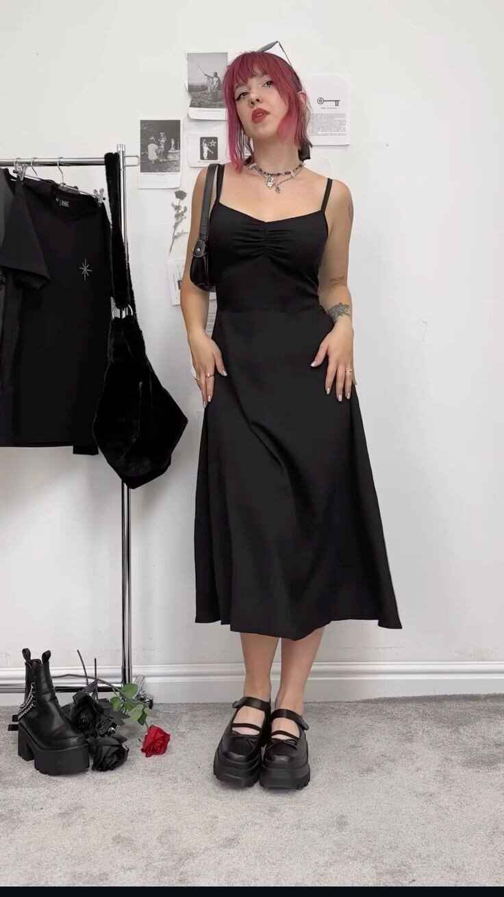 A sleek black slip dress combined with chunky platform boots captures contemporary gothic sensibilities. Mauve-toned hair, silver choker, and moody makeup complete the look. This outfit embodies the evolution of goth fashion, merging vintage elegance with modern edge, and highlights how dark romantic style remains timeless yet continually adaptable for new generations.