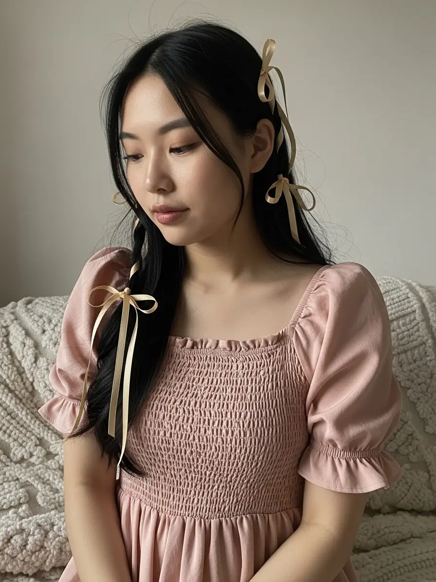 A smocked bodice dress offers texture and shape, while puffed sleeves emphasize romantic volume. Ribbon hair accessories complete the ensemble with youthful sweetness. This outfit feels lighthearted, nostalgic, and charming from every angle.