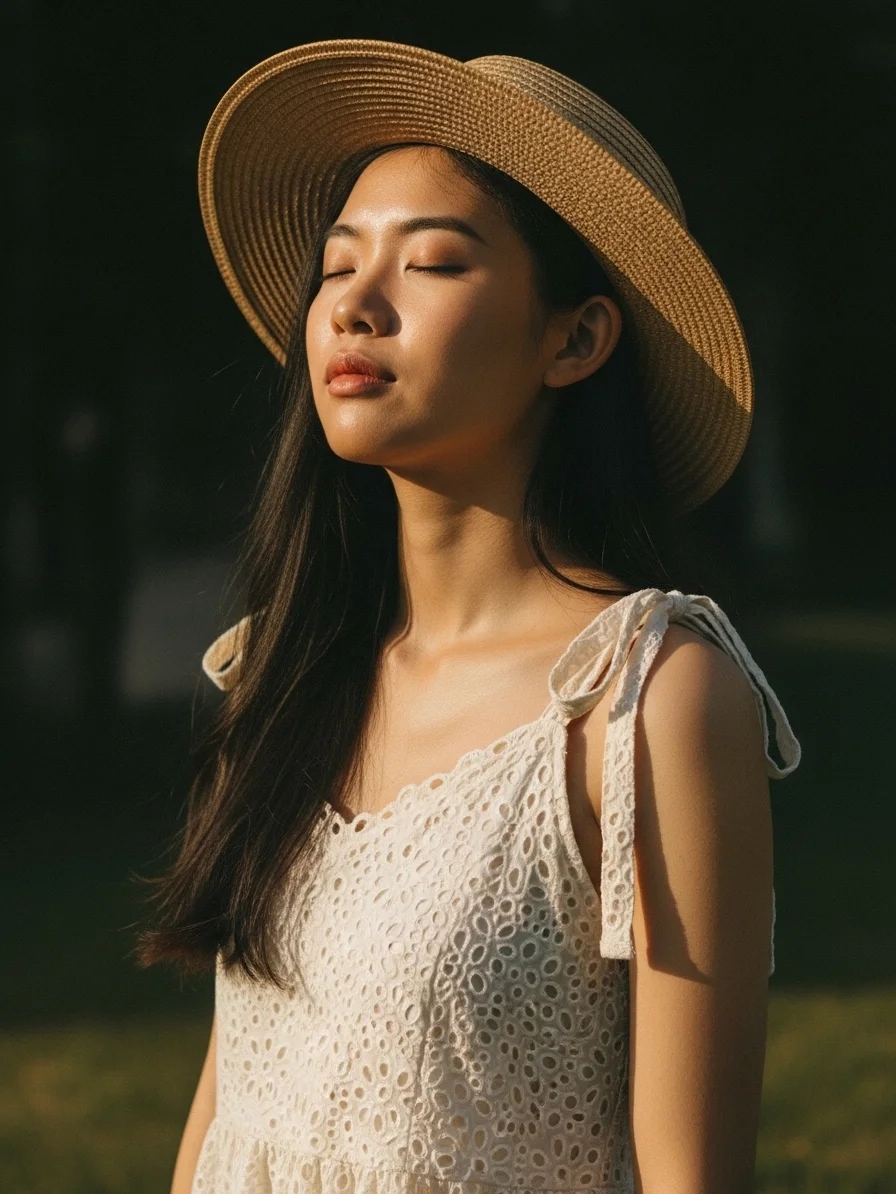 An eyelet lace sundress feels airy, light, and romantic, enhanced by ribbon-tied shoulders for added sweetness. A straw hat completes the look with vintage summer flair. This outfit radiates soft countryside elegance, ideal for warm sunny days.